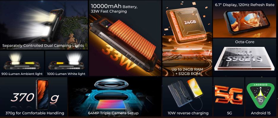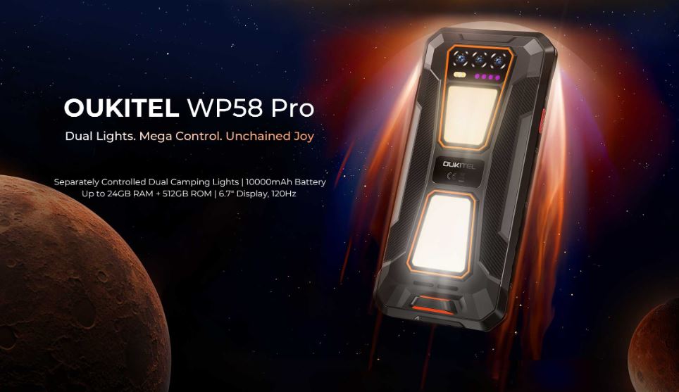 Oukitel WP58 Pro - защищённый смартфон с батареей 10000 мАч, двойным кемпинговым фонарём, памятью 8(+16) ГБ ОЗУ, 512 ГБ ПЗУ, дисплеем 6,7 дюймов, камерой 64 Мп, Android 15, 5G
